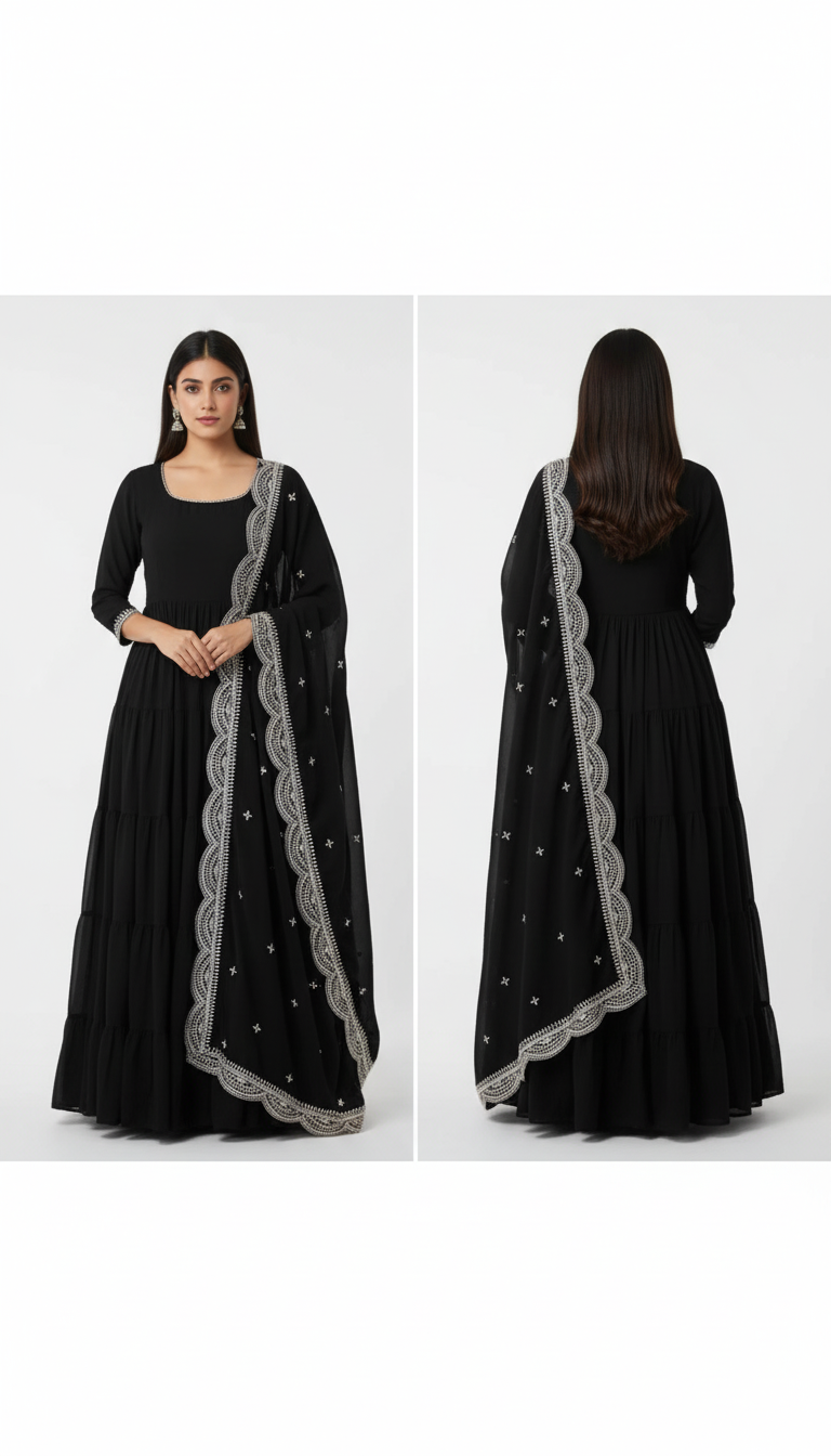 The Black Embellished Poly Georgette Anarkali Kurta with Churidar & Dupatta is more than just an outfit — it is a statement of grace, elegance, and traditional sophistication. With its flowing Anarkali silhouette, intricate embellishments, and complete ensemble, it ensures that you look stunning, confident, and stylish at every occasion.