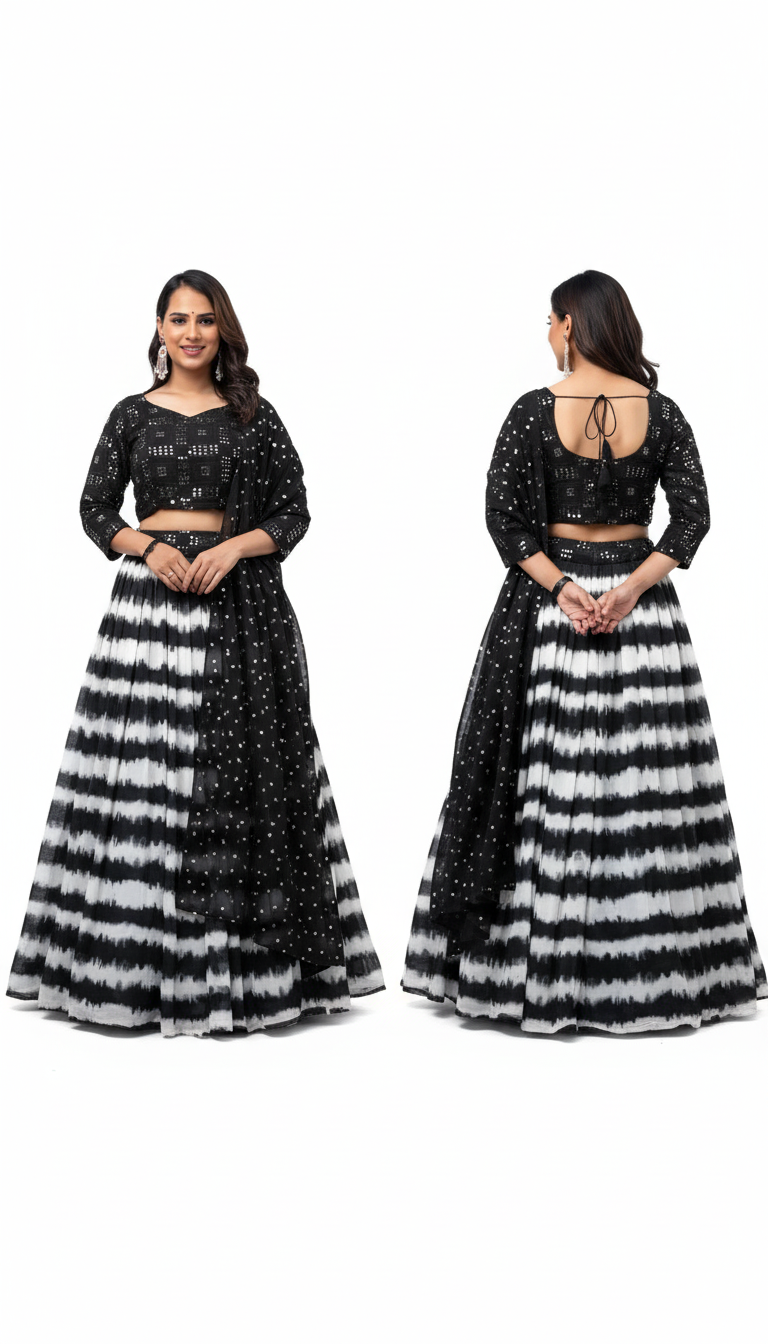 This complete lehenga choli set includes a beautifully designed lehenga (skirt), a matching choli (blouse), and a coordinating dupatta. The ready-to-wear design ensures a perfect fit and allows you to look effortlessly stylish without the hassle of tailoring or alterations. Its luxurious finish and intricate detailing make it a showstopper at any event.